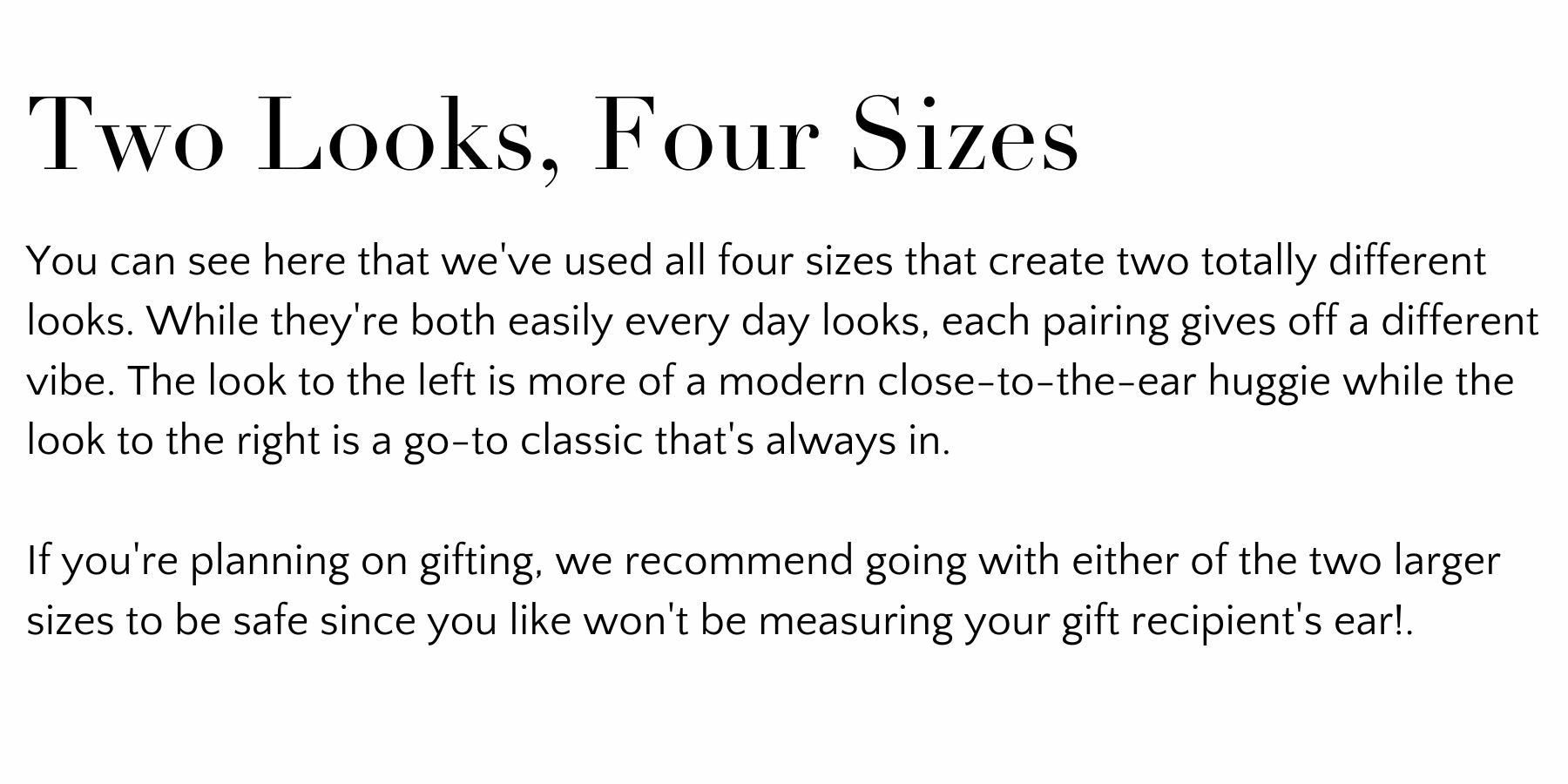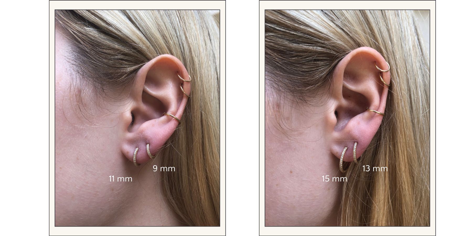 Whether you're looking for more of a classic style with plenty of room at the bottom (15 mm) or you're looking for something more snug for a second piercing or cartilage spot (9 mm), you're covered! Size 13 mm and 11 mm can be perfect for first or second piercings depending on piercing location and the size of your lobe. Everyone is different so be sure to measure!