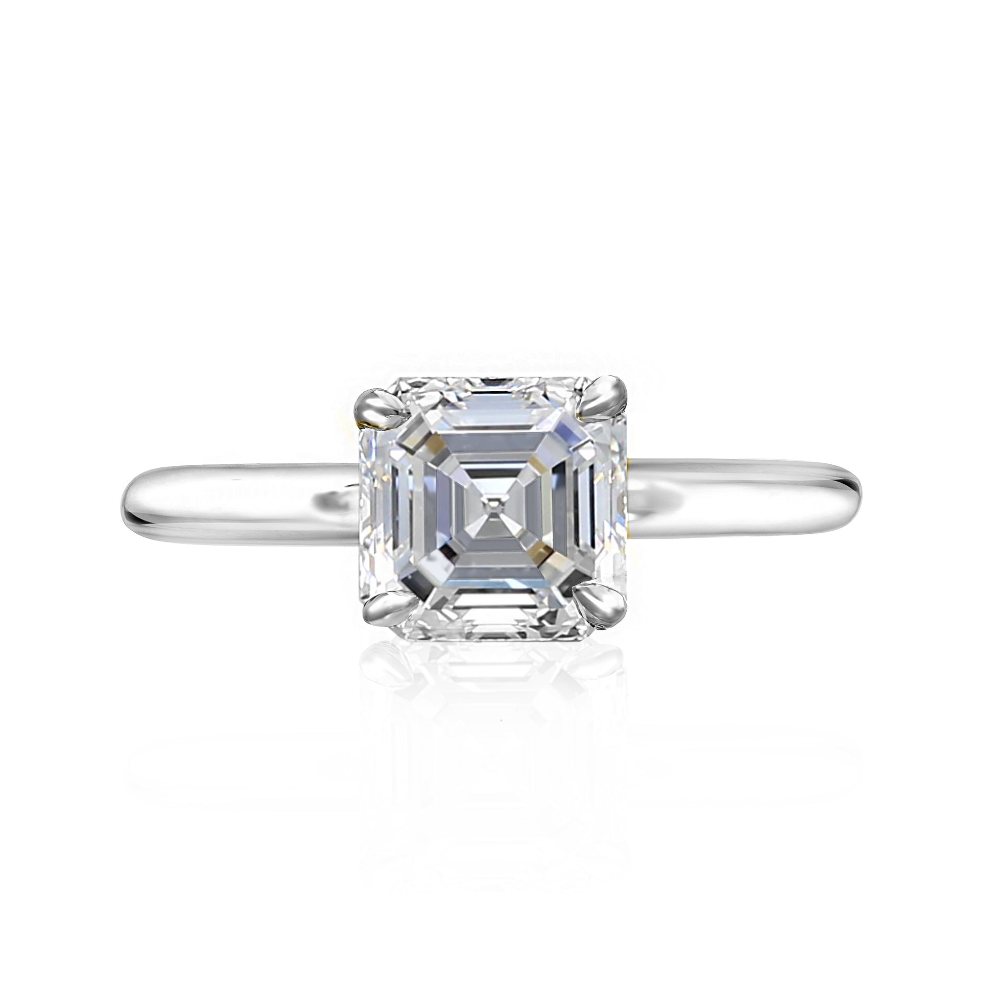 This solitaire features a 1.2 carat Asscher cut diamond—known for its architectural facets and hypnotic symmetry—set in a minimal, low-profile bezel that enhances the stone’s natural geometry. Designed for those who appreciate quiet power and enduring design.