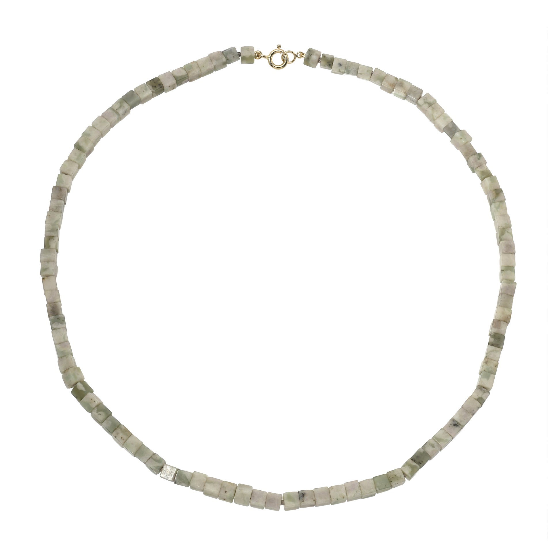 Hand-strung with 4 × 4 mm Chinese Jade cubes, this necklace offers an easy, natural elegance to any look. Finished with a 14K gold spring-ring clasp, it layers effortlessly or stands on it's own.