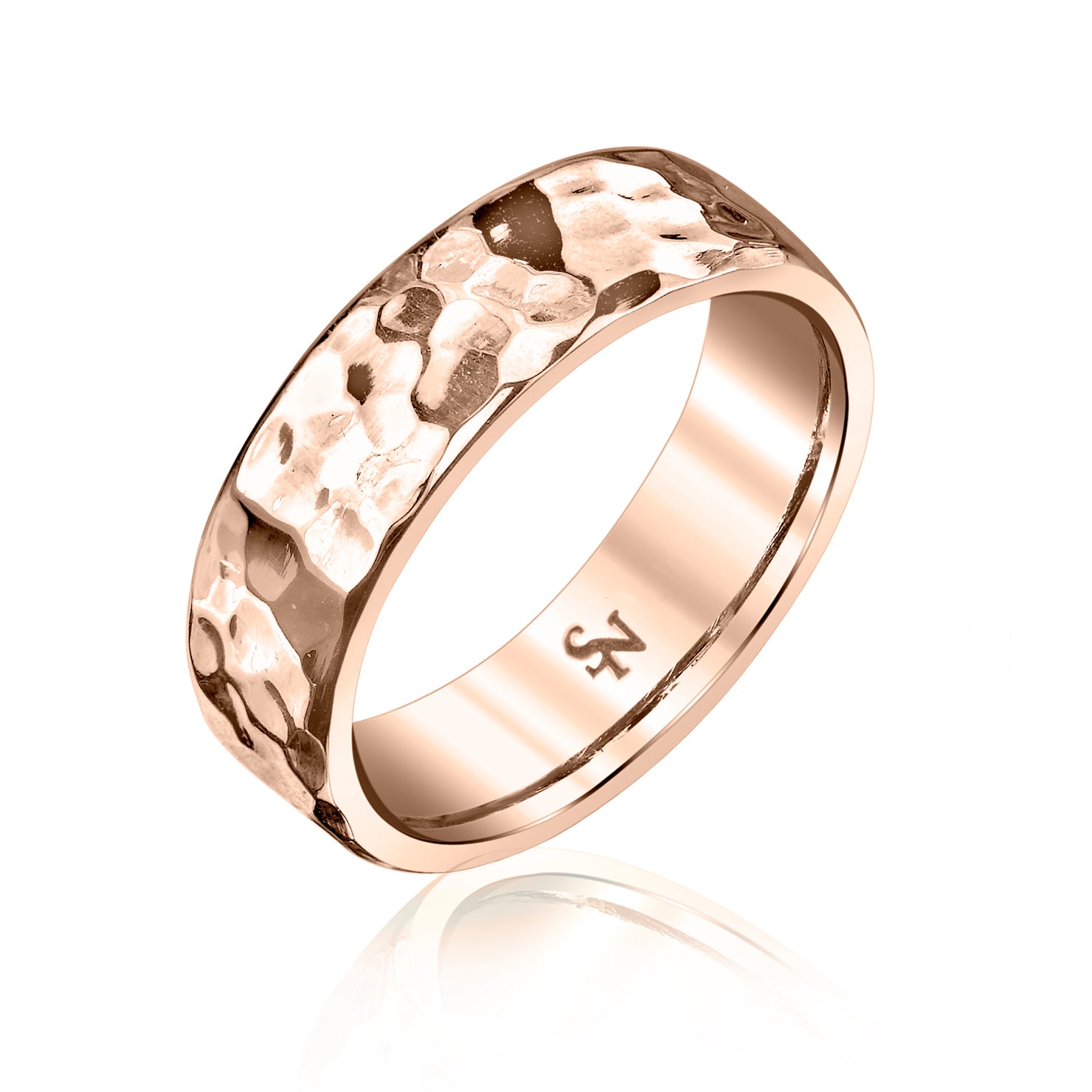 Hand-hammered for texture and strength, this 6mm band brings a tactile rhythm to the clean lines of its flat profile. The organic surface catches light in quiet waves, offering a subtle glow that softens the bold silhouette.