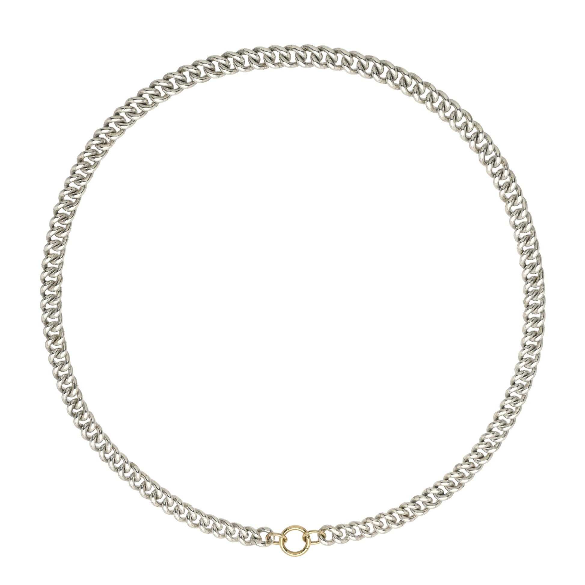 Hand-assembled in Los Angeles, this necklace pairs a 7 mm handmade sterling-silver curb chain with a perfectly round 18K yellow-gold push-gate clasp. Two matching 18K gold connector rings link the clasp seamlessly to the chain.